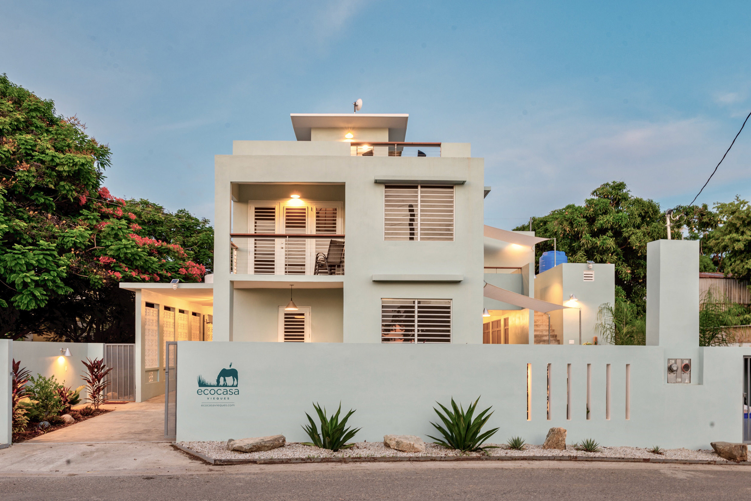 EcoCasa Vieques is a walled compound having two environmentally sustainable rental units (1-Ground Floor Two-Bedroom with outdoor terraces/gardens and 1-Upper Level Three-Bedroom unit with ocean view roof deck), a caretaker's cottage, on-site washer dryer/storage, a naturally ventilated (covered) carport, sustainable gardens, and outdoor terrace spaces to accommodate outdoor lounging and dining. EcoCasa Vieques is designed to be a zero-carbon footprint residential quarters for those interested in vacationing on a beautiful natural island with the world’s most beautiful beaches, snorkeling, fishing, hiking trials, an amazing Bio-Luminescent Bay, wild horses, beautiful/interesting natural fauna, tourist attractions, lovely island charm, all with the ability to live simply and sustainably.