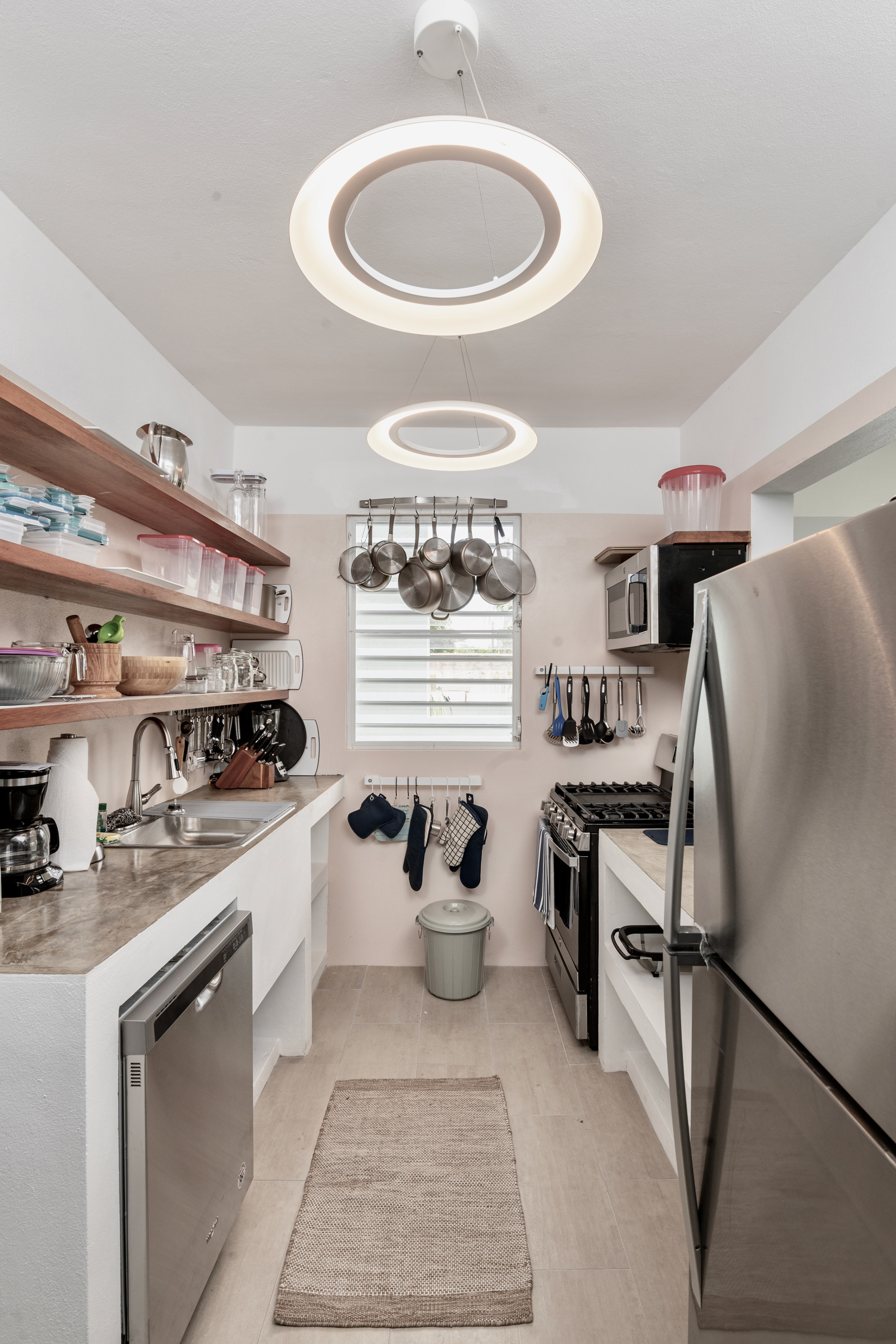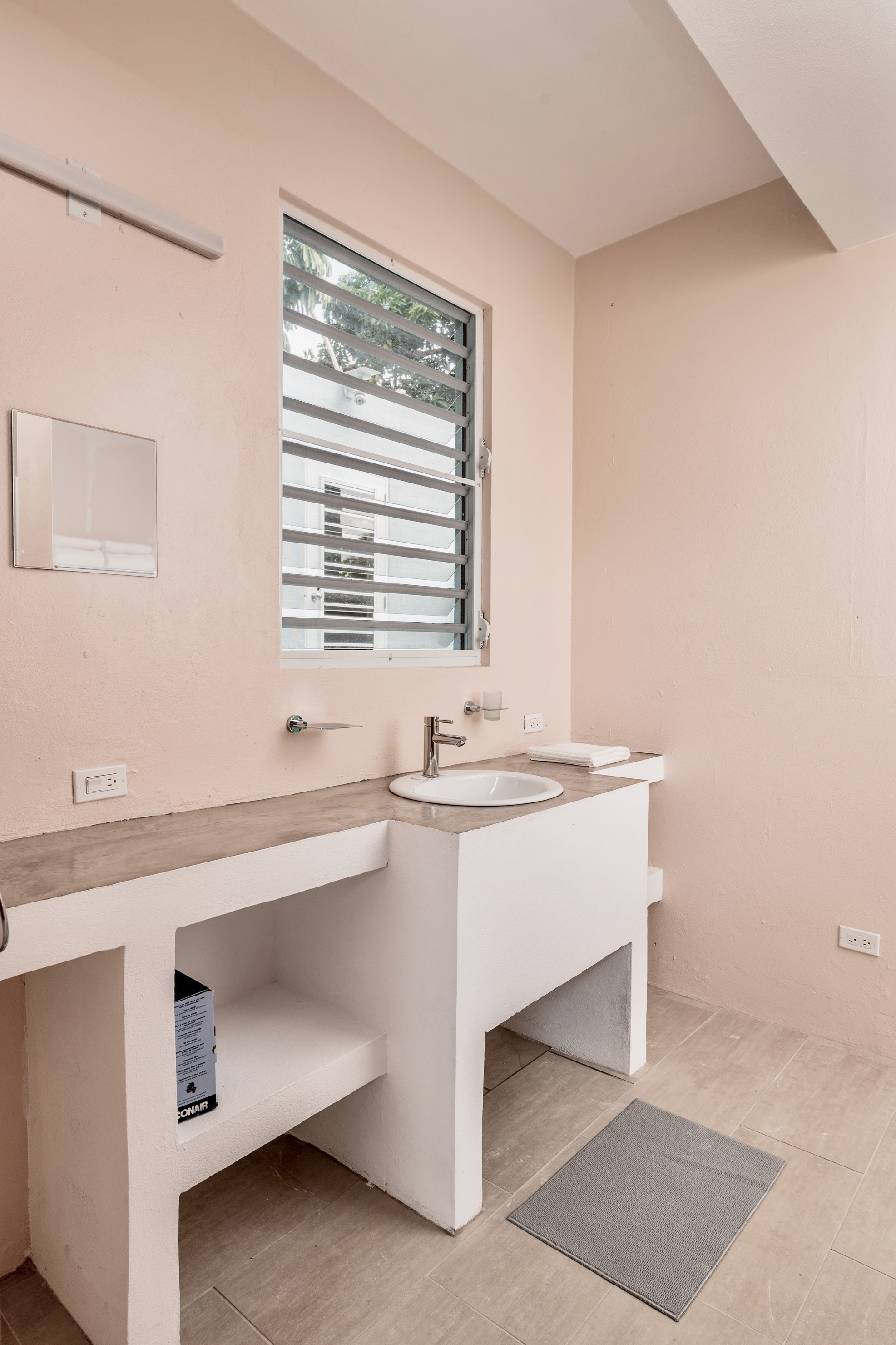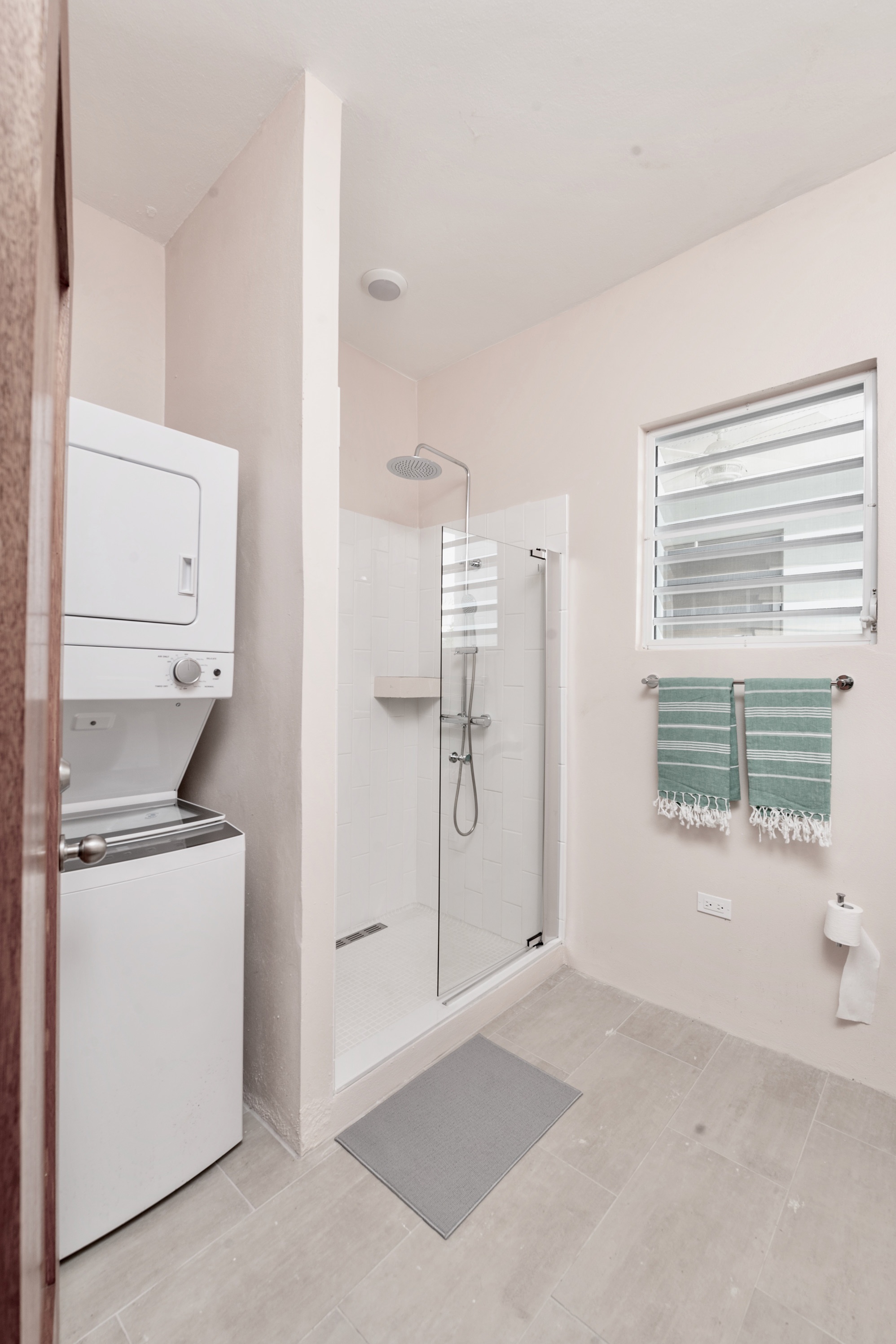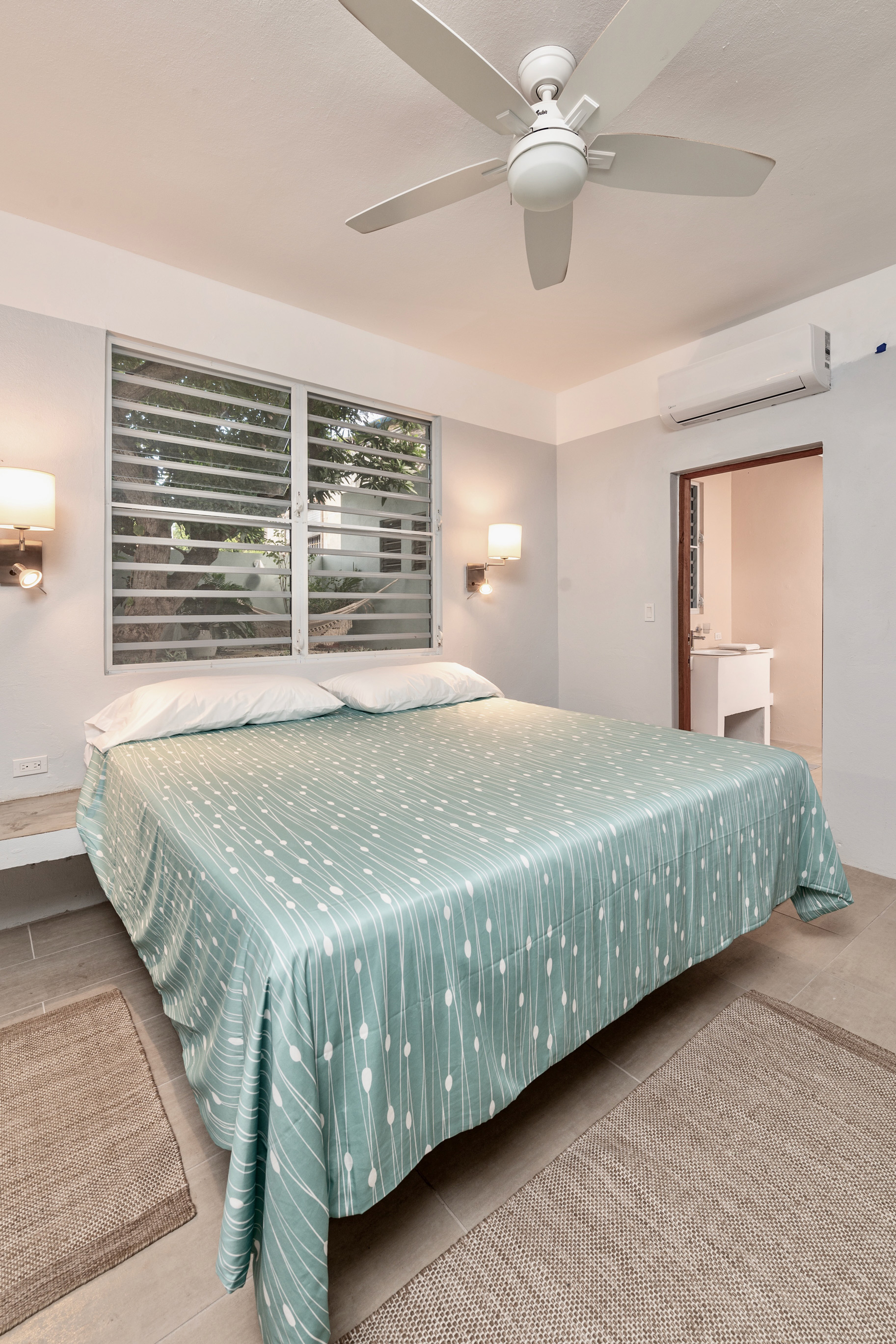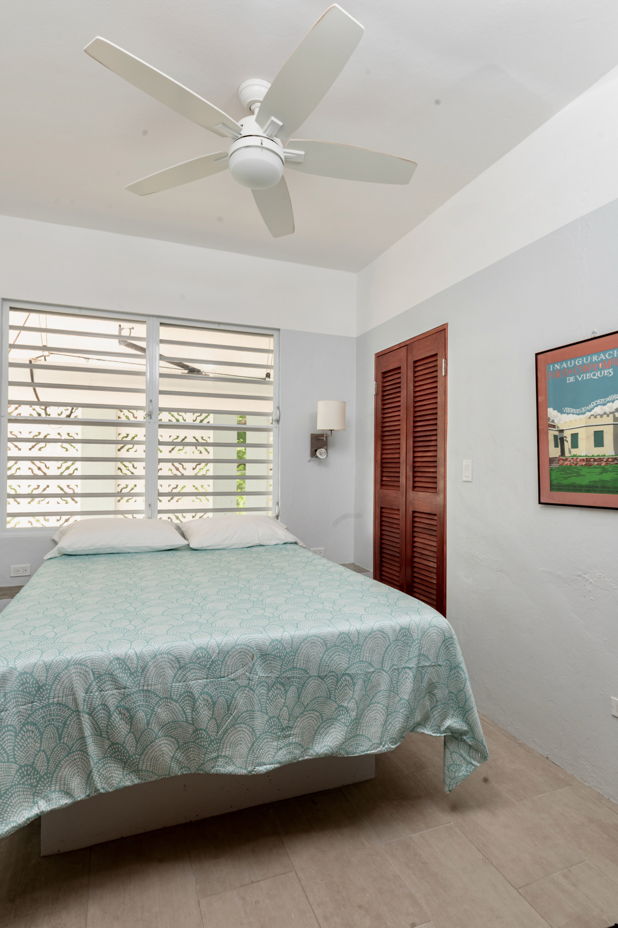 The ground floor 2-bedroom unit is approximately 1060 square feet (not including laundry/support spaces, etc. with a large master bedroom (king-sized bed with a storage closet) with ‘en-suite’ master bathroom. This bedroom has large ceiling fan, bedside reading lamps, side tables, luggage storage multiple louvered glass security windows for natural through ventilation, with an additional AC unit to provide cooling in extreme conditions. The slightly smaller bedroom (queen-sized bed with a storage closet) has its bathroom across the hall. This bedroom also has a large ceiling fan, multiple louvered glass security windows for natural through ventilation, with additional AC unit to provide cooling in extreme conditions.