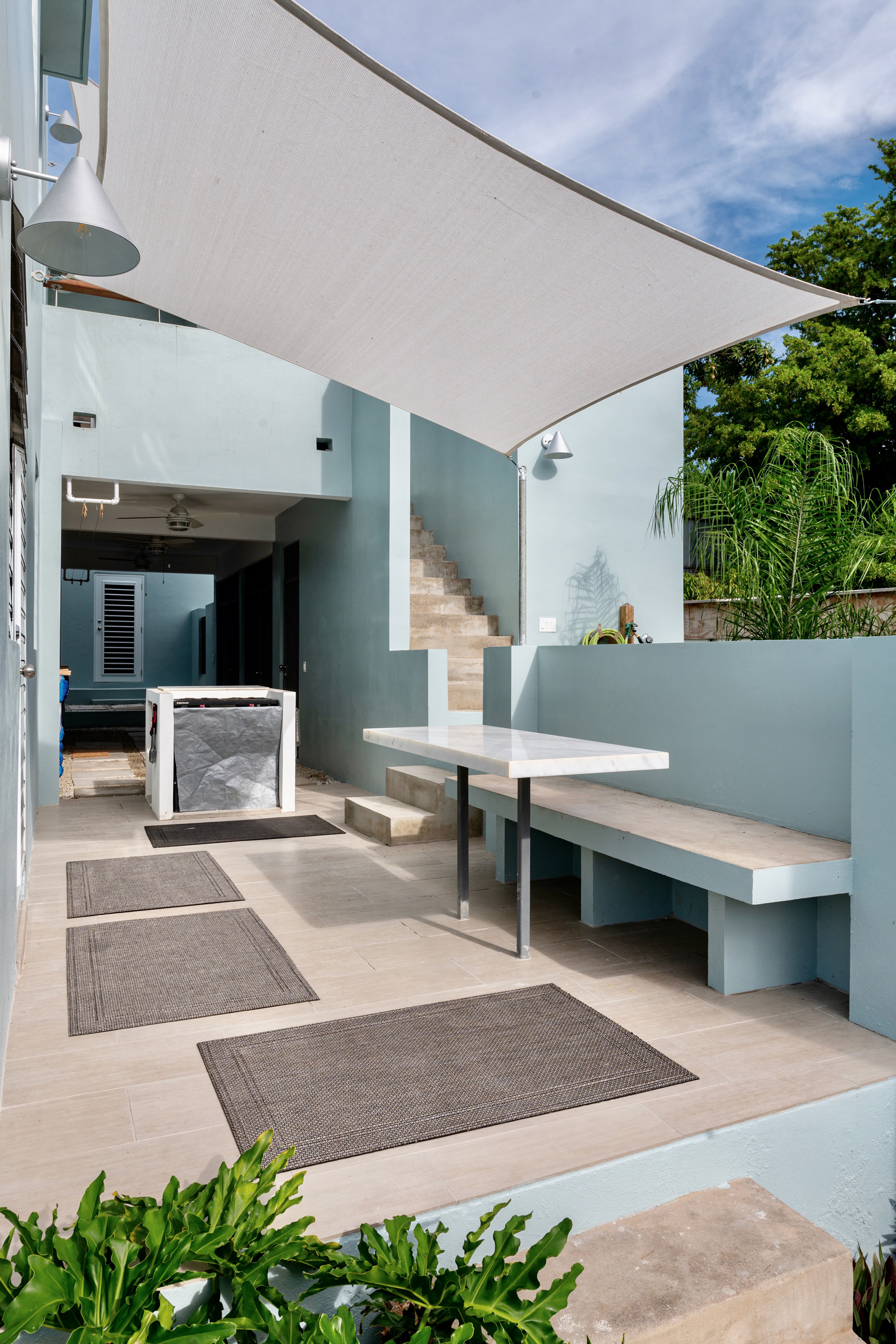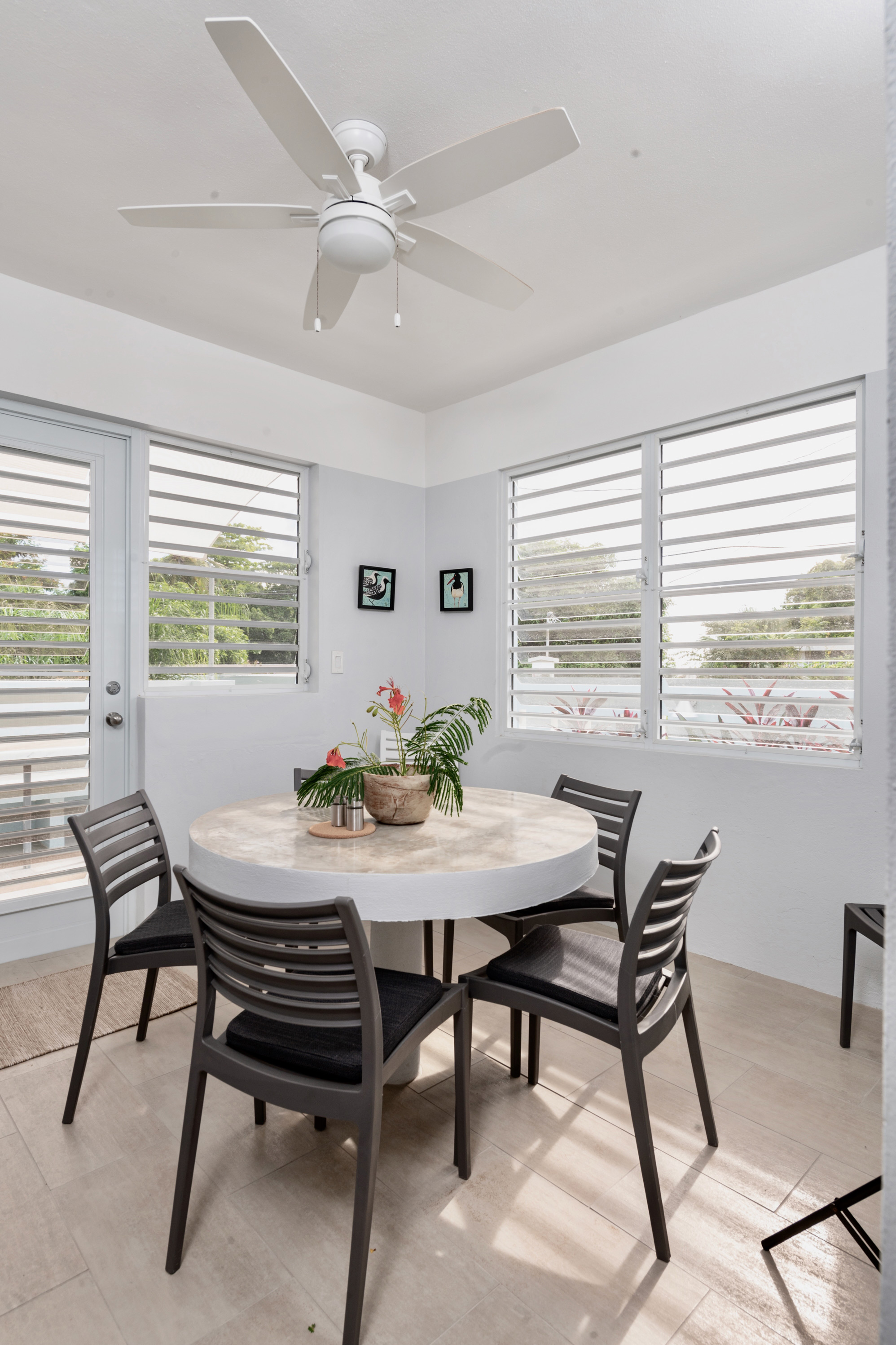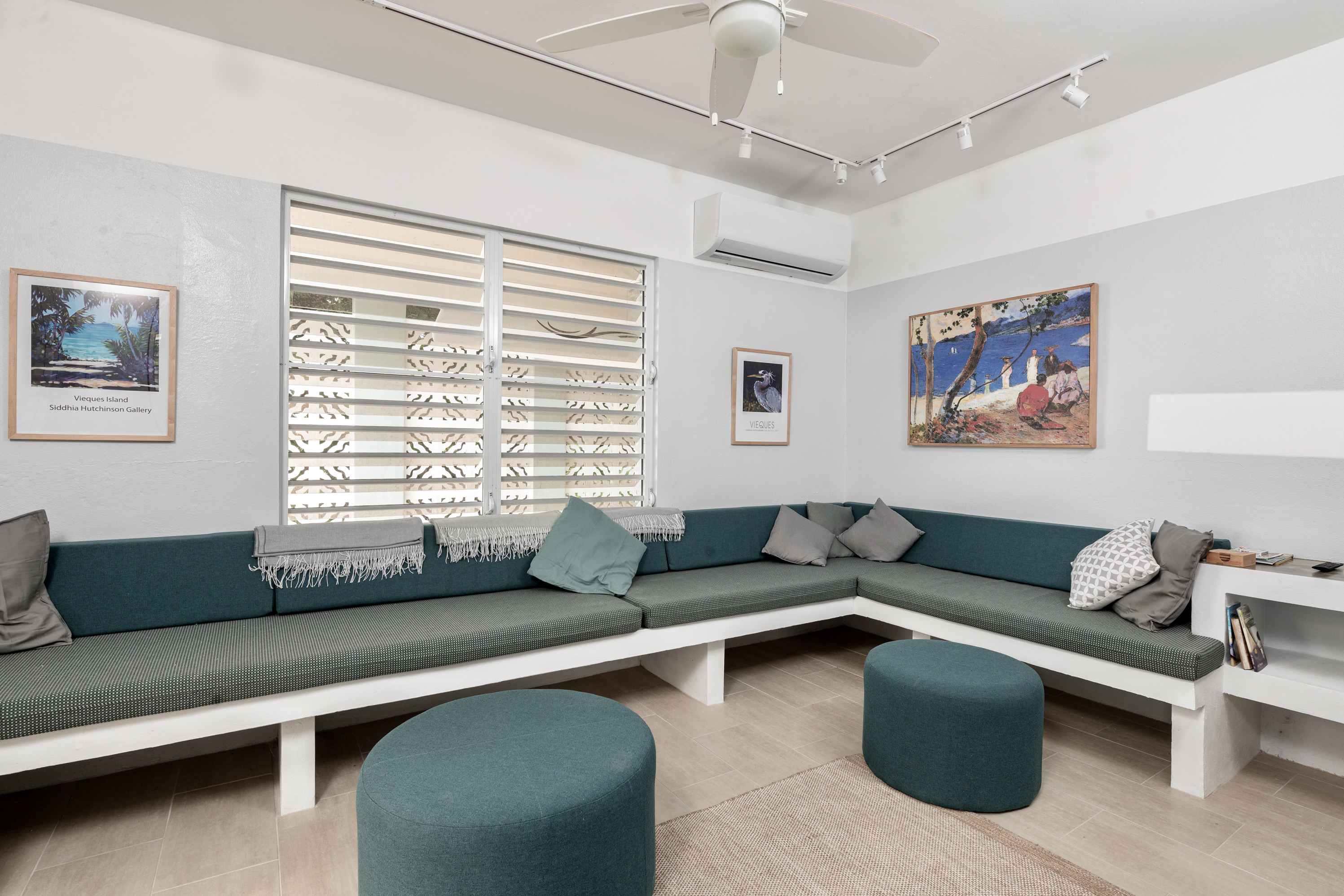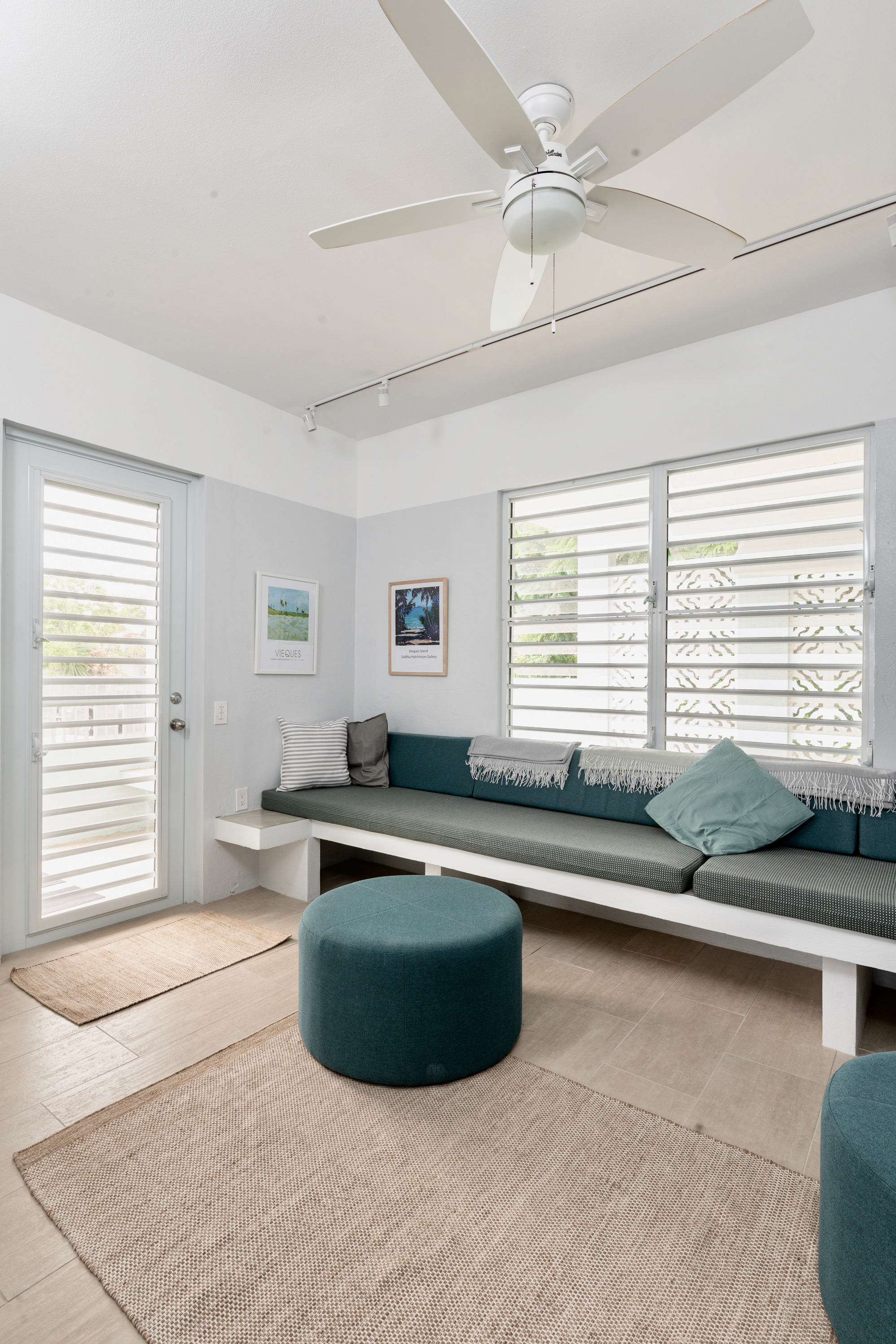 The open dwelling plan area: kitchen, dining, living, are designed to allow for relaxed and comfortable socializing. The unit comes completely furnished with a house and island user manual. The kitchen is modern and provisioned with all new efficient high end appliances, dishwasher, & convenient flatware/cutlery storage with dining-kitchen pass-through storage area. Adjacent to the indoor dining, is a canopy-shaded, furnished outdoor dining terrace. The house has internet service throughout, has a special internet docking lounge station for streaming in a very comfortable lounging area which can accommodate multiple guest(s). Similar to the dining area, adjacent to the living room is a front entry outdoor loggia/terrace with standup views of Vieque’s beautiful bay.